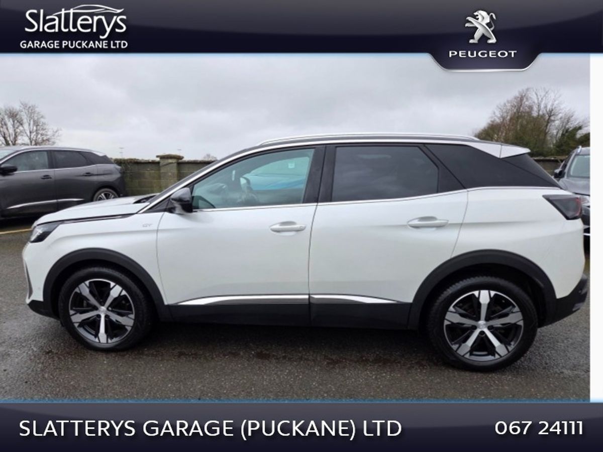 2024 3008 GT HDI Auto 8 speed in excellent condition. This SUV comes with remaining manufacturers warranty until Jan 2029 or 100,000 Kms. Standard features include Reversing camera, Park assist, Bluetooth interface, Adaptive cruise control, Auto led Lights with high beam assist, Privacy glass, Navigation, Apple carplay / Android auto, Power folding door mirrors, Safety pack, 18" diamond cut alloys, & many more features. Competitive finance packages available. Call Niall, Michael or Andrew on 067/24111 for more details.