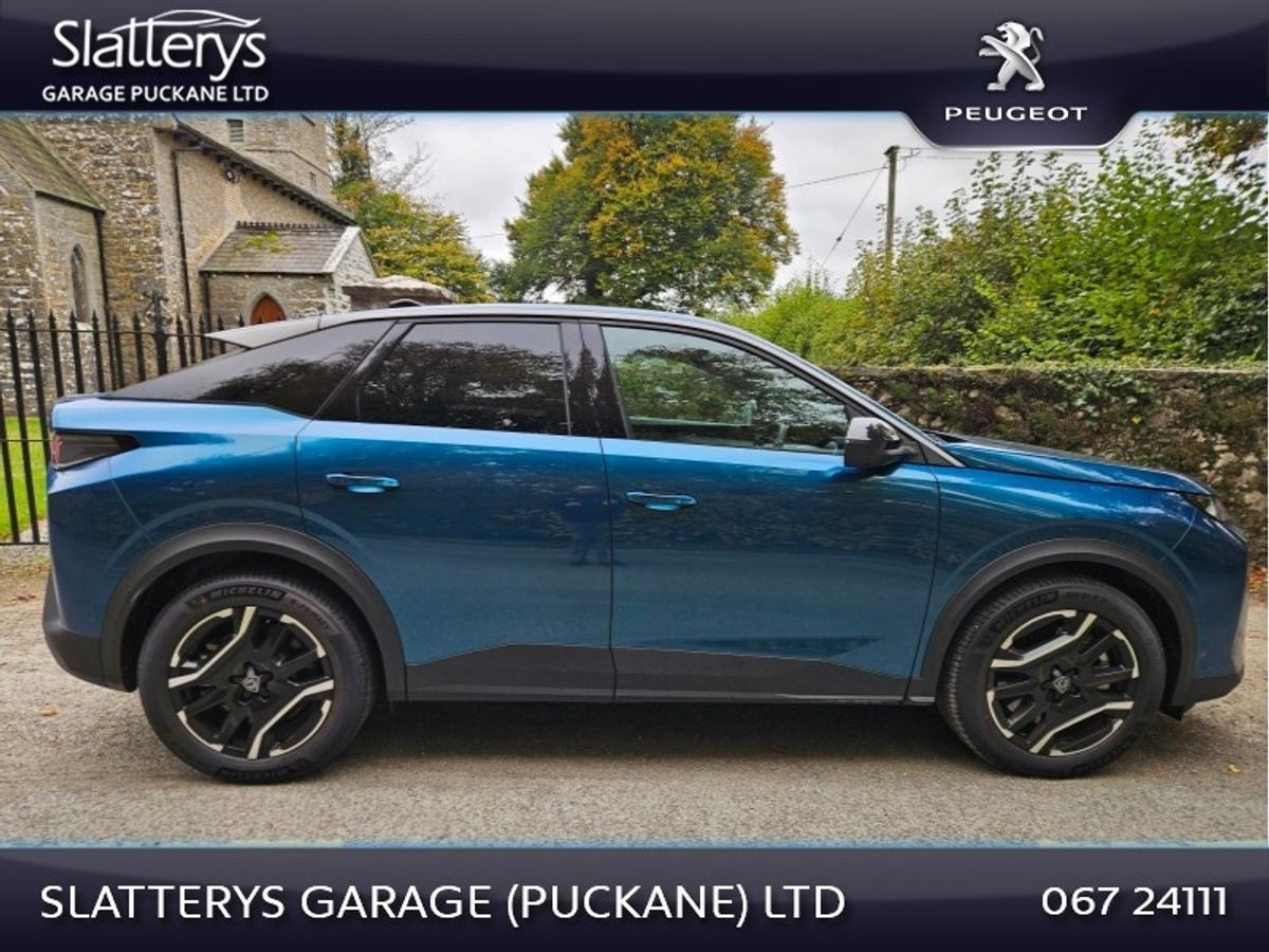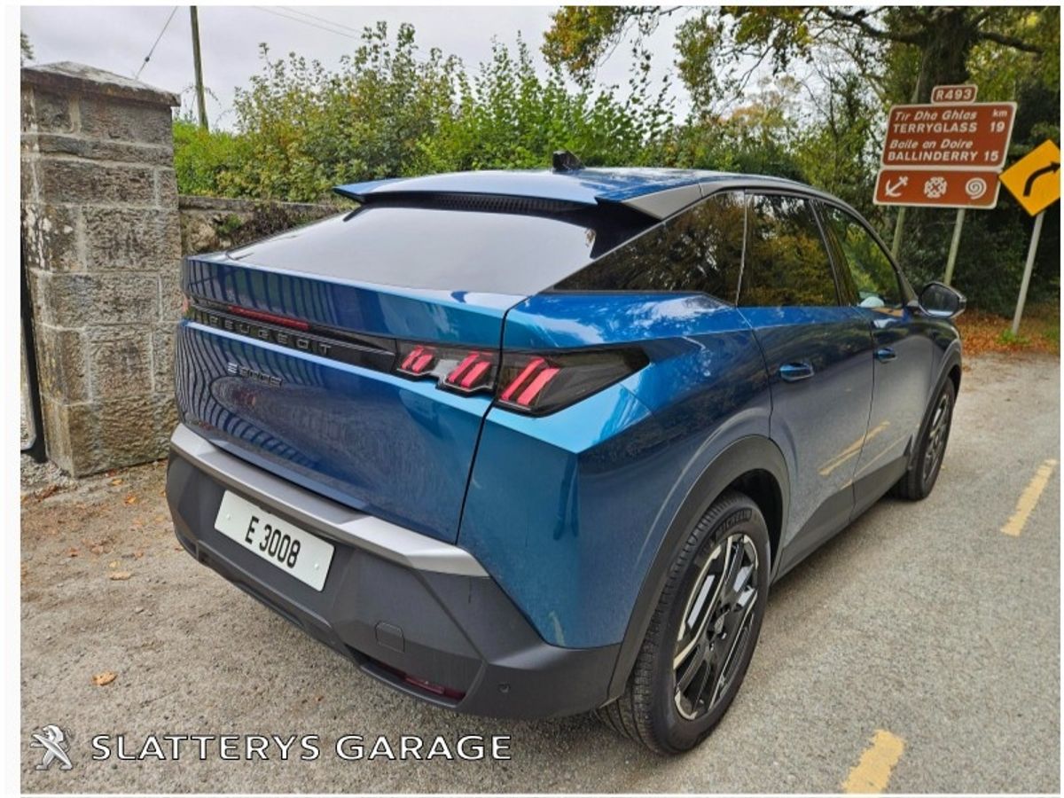 e3008 Allure EV available with 525 kms of range / 73kwh. This SUV comes with 5 yrs unlimited mileage warranty for total peace of mind. Standard features include Heat pump, 360 degree vision with drive assist pack, Naigation, Wireless Apple carplay / Android auto, 19" Diamond cut alloys, Auto LED Lights with high beam assist, 21" curved Panoramic i cockpit screen, Keyless open & go, Adaptive cruise control, Privacy glass & many more features. Competitive finance packages available with PCP available from €368.00/Mth over 36 mths. Call Niall, Michael or Andrew on 067/24111 for more details.