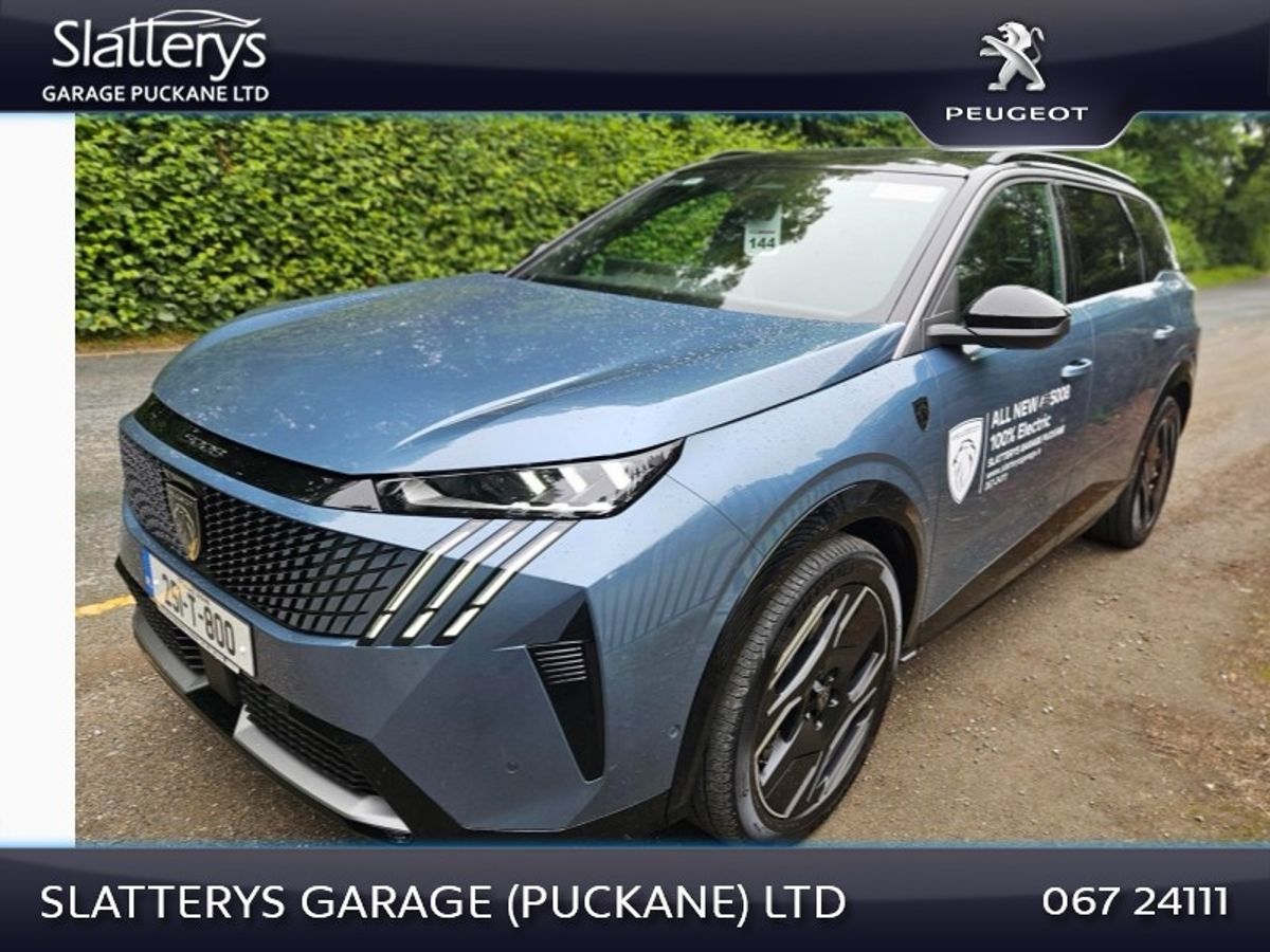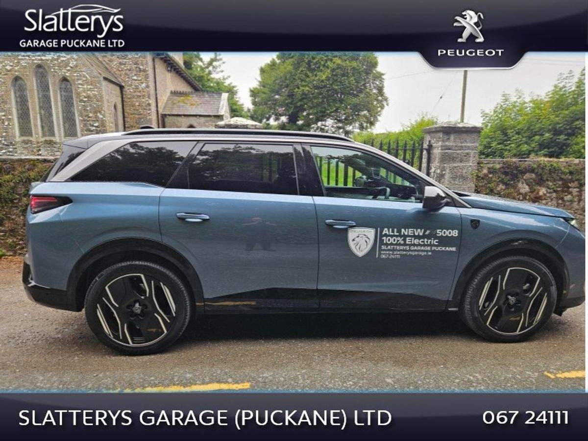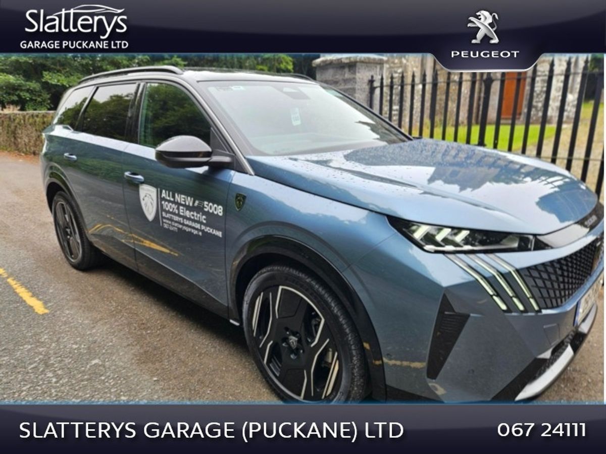 251 5008 GT EV demo model in spotless condition. This SUV 7 seater comes with remaining manufacturers warranty until Jan 2029 or 100,000 kms. Standard features include, 73 kWh battery with 500 kms range, Heat pump, 360 Degree camera, Park assist, Bluetooth interface, Privacy glass, Safety pack, Peugeot Pixel LED lights with Adaptive high beam assist, Electric Tailgate, Upgraded Alcantara upholstery, Rear door sunblinds, 19" Diamond cut alloys, Safety pack, Lane keep assist, Peugeot panoramic i cockpit with 21" floating curved screen, Peugeot open & go, Navigation, Wireless Applecarplay/Android auto, Adaptive cruise control & many more features. Competitive finance packages available. Call Niall, Michael or Andrew on 067/24111 for more details.